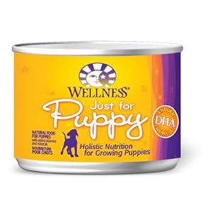 Water is an extremely important nutrient with respect to a dog's overall well-being. Formulated with the same whole food philosophy as our kibble -- complete and balanced nutrition using only the finest ingredients -- Wellness canned foods are an easy way to increase your dog's water intake. Wellness Just for Puppy Canned Recipe is nutritionally balanced with fruits, vegetables, vitamins, and minerals to support the development of strong muscles, bones, organs, and teeth. Real-food ingredients include "de-boned" chicken, salmon, barley, flaxseed, carrots, sweet potatoes, apples and pears.